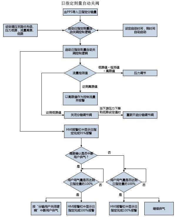 (3)當(dāng)指定日輸氣總量控制時,當(dāng)?shù)竭_(dá)日輸氣量達(dá)到設(shè)定值時,關(guān)閉三個支路的電動閥。并將狀態(tài)反饋給上游控制系統(tǒng)。