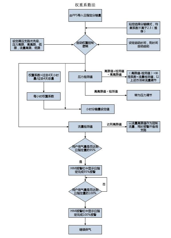 分輸權(quán)重系數(shù)控制邏輯,在連續(xù)供氣用戶使用,將用戶24小時用氣分為12個時段,每天早8點(diǎn)程序根據(jù)過去4天各時段累計流量與前一日累計流量的對比,通過加權(quán)平均計算出當(dāng)日權(quán)重系數(shù),每個時段按日指定氣量與相應(yīng)的權(quán)重系數(shù)乘積進(jìn)行氣量控制,從而反向擬合用戶用氣規(guī)律,最終達(dá)到在一定壓力范圍內(nèi)日指定氣量控制的目的。